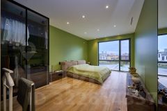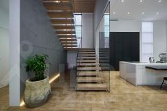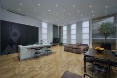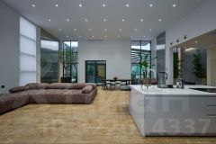 В доме на трех уровнях расположены хозяйская мастер-спальня, детские комнаты, гостевая мастер-комната и комната для персонала, огромная гостиная 75 кв метров с зоной кухни на первом уровне с высокими потолками, прачечная, помещение для элементов управления системами отопления и вентиляции.