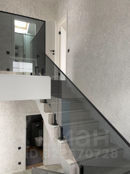 Лестница из бетона, отделка - керамогранит, стеклянные лестничные ограждения