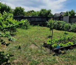 Кусты- смородина красная и чёрная, крыжовник, малина,