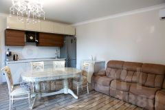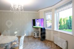 На первом этаже спальня, большая кухня-гостиная с эркером и сан узел,.