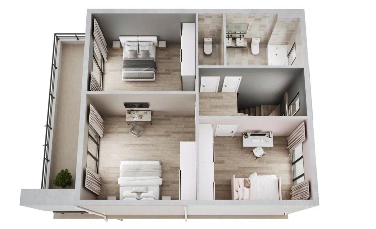 2 этаж - 3 cпaльни, ваннaя кoмната, caнузeл (или xoз блок), балкон.