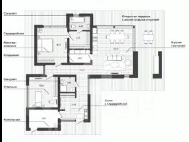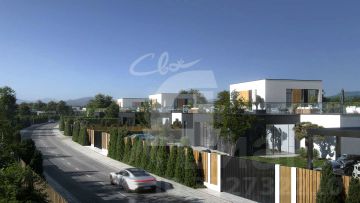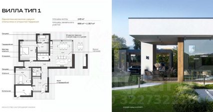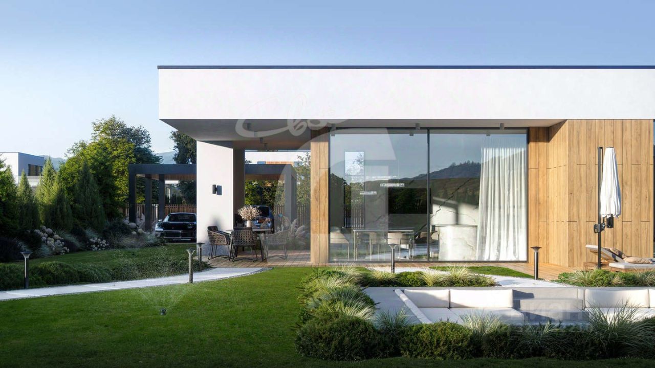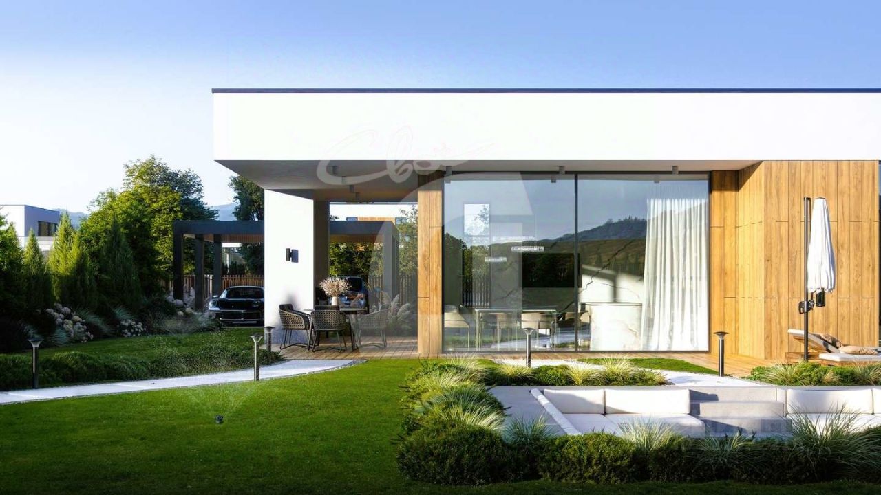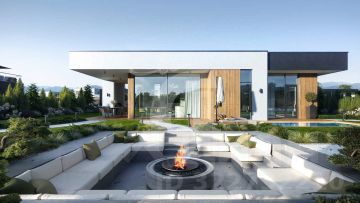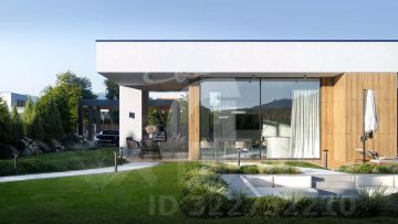 Одноэтажная вилла в стиле хай-тек с двумя спальнями, открытой террасой, эксплуатируемой кровлей и панорамным остеклением.