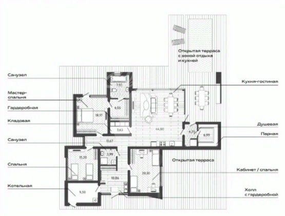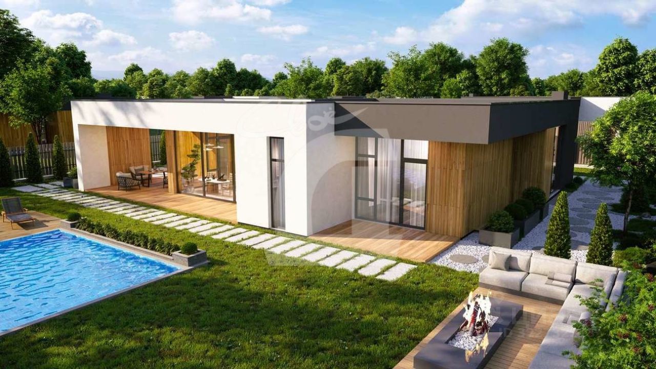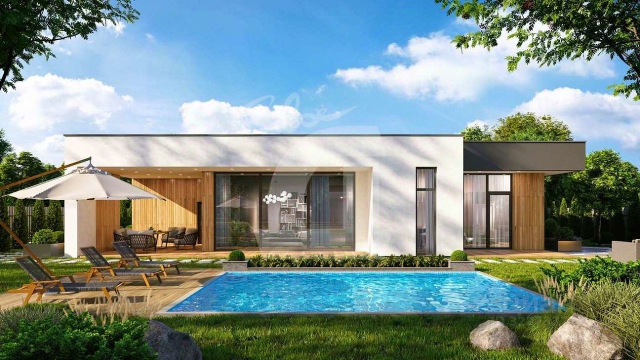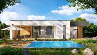 Одноэтажная вилла в стиле хай-тек с тремя спальнями, собственной парной, открытой террасой, эксплуатируемой кровлей и панорамным остеклением.