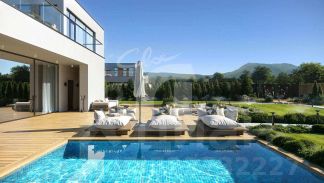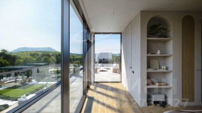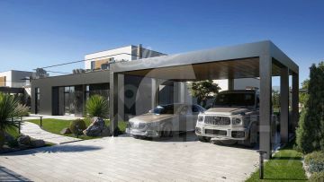 Двухэтажная вилла в стиле хай-тек с тремя спальнями и отдельной гостевой студией, собственной парной, открытой террасой, панорамным остеклением, и мастер-спальней с террасой на эксплуатируемой кровле.