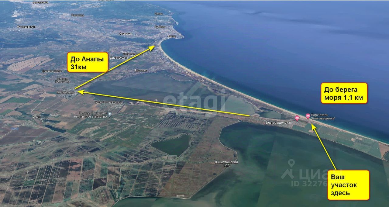 Расстояние до моря 1 км. Развитая инфраструктура станицы подходит как для постоянного проживания, так и для организации туристического бизнеса. Есть все необходимое для комфортной жизни: магазины, школа, детс.