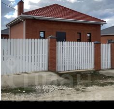 Забор по периметру: кирпичные колонны, белый штакетник, калитка, откатные ворота.