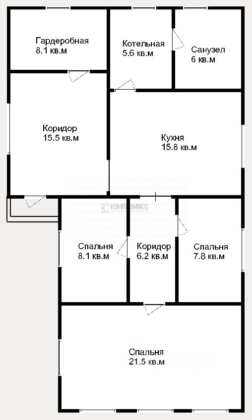 3 раздельных спальни, кухня, просторный коридор, гардеробная, котельная, санузел;