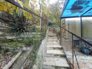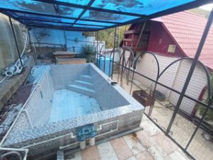 Участок под уклоном, частично террасирован, с мангальной зоной, капитальным бассейном, гостевым домиком, вольером для собак, баней.