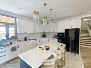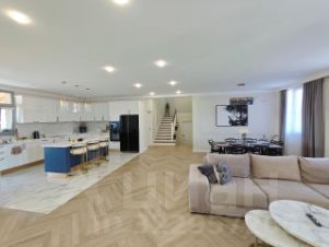 -На первом этаже расположились: большая прихожая, просторная кухня гостиная в которой удобно готовить в четыре руки и пить чай дружной компанией, а шикарный кухонный гарнитур со всей необходимой встроенной техникой и дизайнерская обеденная зона помогут вам в этом, с кухни гостиной есть выход на шикарную угловую террасу, также на первом этаже имеется душевая с санузлом и котельная, на второй этаж ведет удобная широкая лестница.