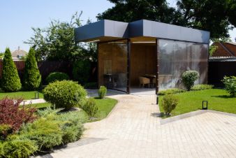 Во дворе располагается крытая беседка барбекю на большую компанию, так же зона отдыха с очагом и каркасный бассейн.