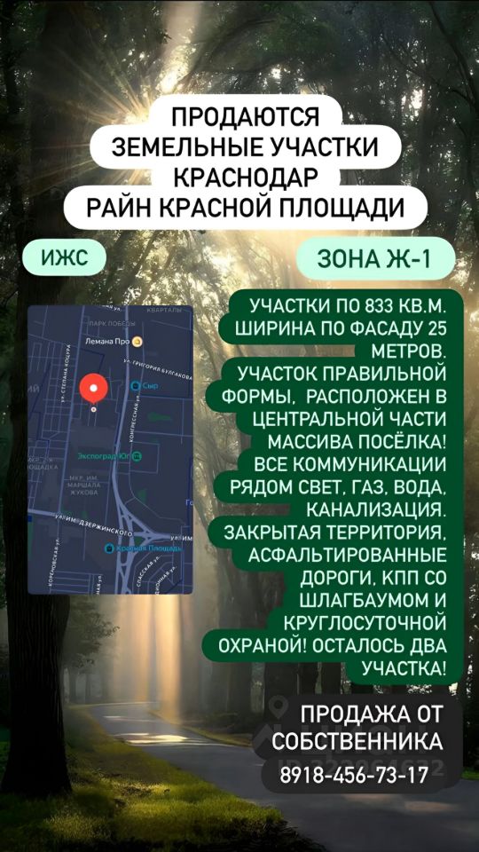 Продажа от собственника земельные участки 833 м2. Ширина участка по Фасаду 25 метров. Участок правильной формы, расположен в центральной части массива посёлка! Все коммуникации рядом Свет, Газ, Вода, Канализация. Закрытая территория, Асфальтированные дороги, КПП со шлагбаумом и круглосуточной охраной! Район Красной площади, в шаговой доступности Садик, Школа, Супермаркет "Табрис". Осталось два участка, успейте купить!