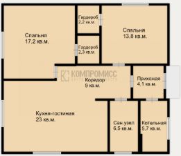 В доме 2 спальни, кухня-гостиная, коридор, сан. узел, 2 гардероба, котельная.