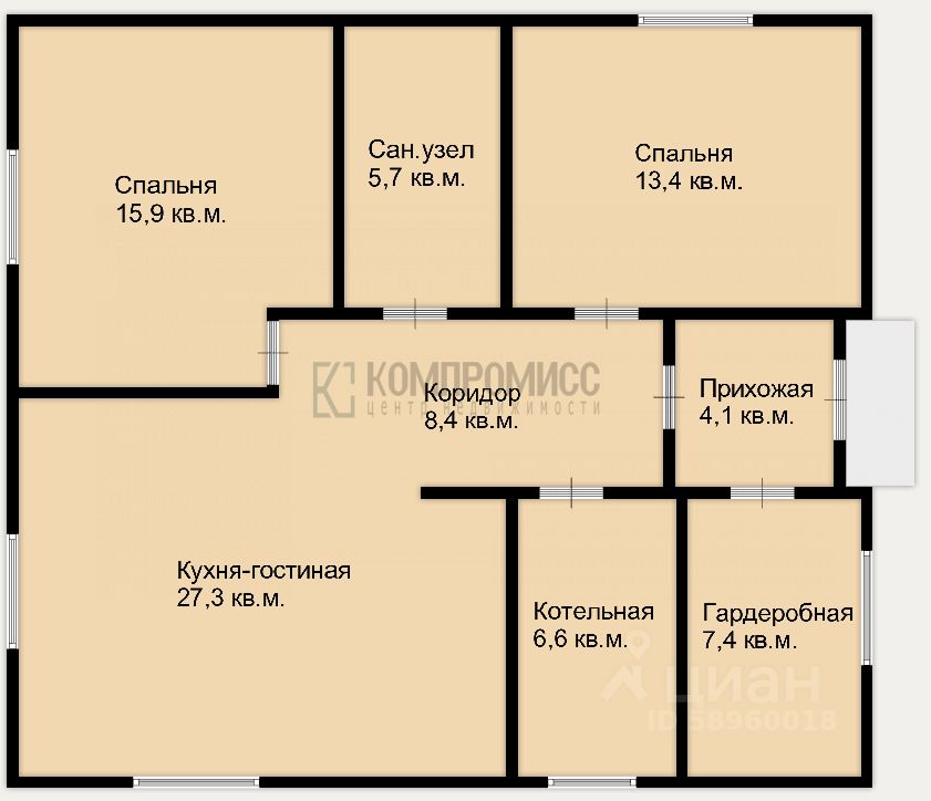 В доме 2 спальни, кухня-гостиная, коридор, сан. узел, гардеробная, котельная.