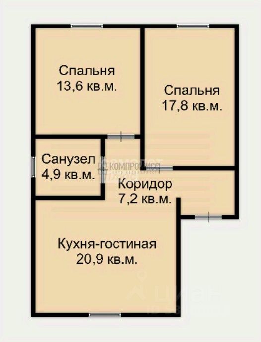 В доме: 2 спальни, кухня, совмещенный санузел, коридор.