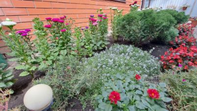 За оградой молодые плодовые деревья черешни и вишни уже радуют сладкими ягодами, есть небольшая грядка с клубникой.