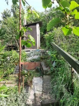 Участок ухожен, разделен на грядки для посадки овощей и зелени, к которым проведена система для полива. Есть плодовые деревья: 2 инжира, киви, 2 хурмы, 3 яблони с разными сроками созревания, молодые деревья груши, сливы и вишни, также растёт малина, земляника, смородина и крыжовник.