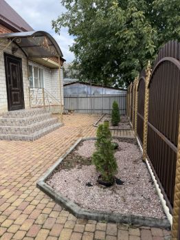 Высокий забор , двор в тротуарной плитке , так же клумбы для деревьев и цветов