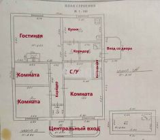 В доме кухня, гостиная с камином, три спальных комнаты, санузел совмещенный, котельная, два коридора. В доме сделаны два входа - один центральный, второй со двора.