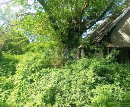 Ранее был обжитой, с ветхим домостроением и хоз.блоком (гараж и кладовые), данные постройки в стоимости не учитываются. Сейчас на участке находится старый запущенный сад. К дому ранее было подведено электричество, столбы вдоль забора. Вплотную к забору - коллективная водонапорная емкость. Есть гидрогеологческая перспектива буриться на воду на участке.