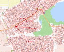 до школы 18 - 1,5 км, до д/с - 1 км, до ДК - 1 км, до Администрации, Автостанции 2,2 км, до поликлиники - 2,3 км, до школы 6 -1,8 км.