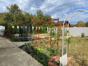 Участок площадью 8 соток полностью освоен: на нём высажены молодые плодовые деревья и кустарники, а также устроены высокие грядки для выращивания овощей.