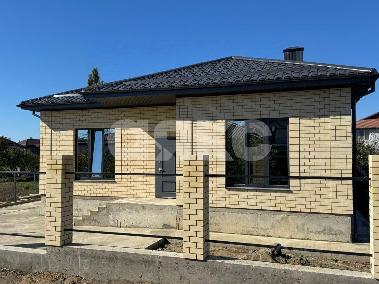 Дом построен по монолитно-блочной технологии, облицовка - кирпич. Огорожен забором из металопрофиля.