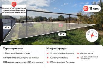 Параметры участка: фасад 25 м, глубина 43 м. Ровный, без уклона. Участок имеет правильную (прямоугольную) форму.