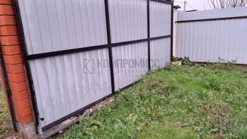 с одной стороны, с фасада забор из профлиста на кирпичных столбах. Ширина