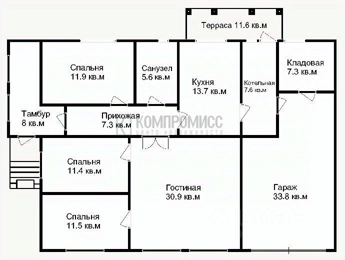 кладовая, котельная с выходом на террасу, прихожая, тамбур, гараж. Участок 7.7