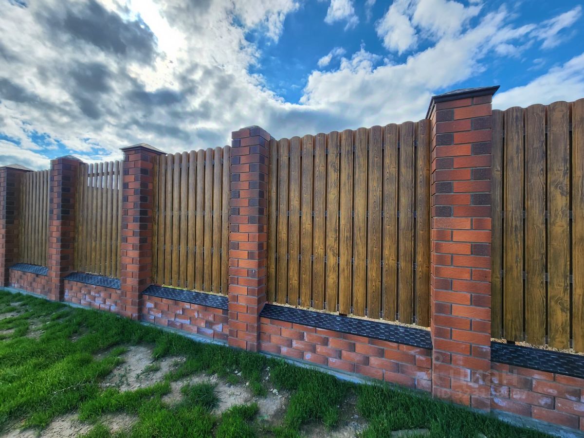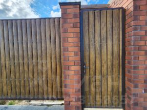 Участок огорожен забором на фундаменте из премиум-профиля под дерево 3,5м высотой с откатными воротами и калиткой.