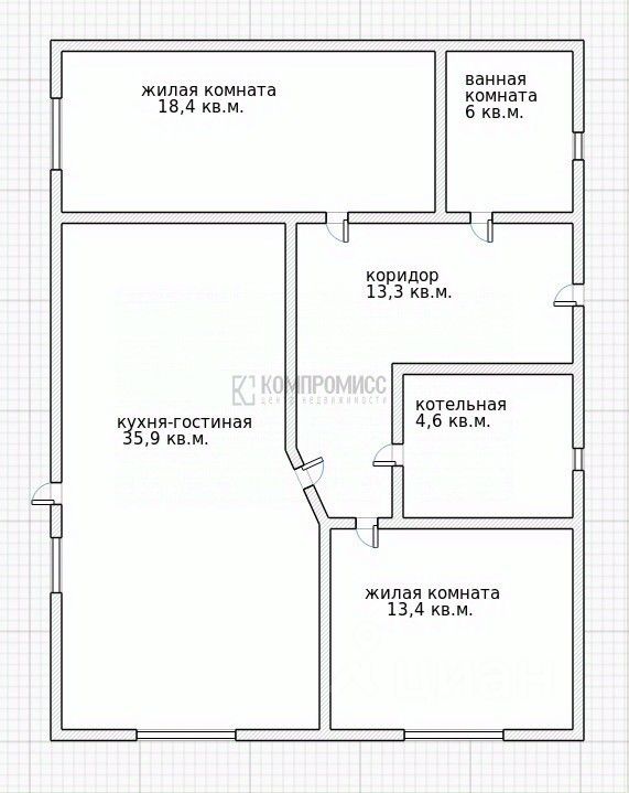 В доме кухня-гостиная 35.9 кв. м., две изолированные жилые (возможность третьей спальни за счет большой площадь куни-гостиной), ванная комната, гардеробная, холл-коридор, котельная.