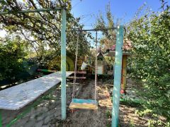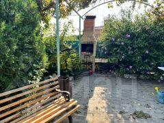Закрытая территория с зоной для отдыха:мангал, детская площадка, беседка. Везде высажены декоративные кустарники, цветы.