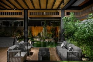 • Большая крытая терраса площадью 46м² с уличной мебелью и подвесной качелей, уличная кухня, зона барбекю и зона отдыха на лужайке.