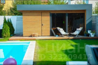 Современная баня на дровах с панорамным остеклением и видом на бассейн.