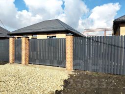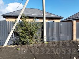 Участок 3,3 сотки земли, назначения ИЖС, огорожен по периметру забором, с фасадной стороны — кирпичные колонны, евроштакетник, откатные ворота, калитка.