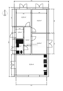 Площадь дома- 77,5 кв.м., с тремя изолированными жилыми комнатами, кухней, просторным санузлом и коридором.