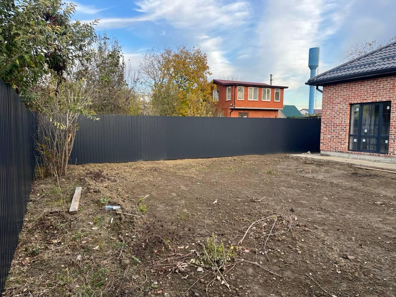 Участок по периметру огорожен забором ,по фасаду откатные ворота ,калитка.Двор забетонирован,отмостка,большой навес для автомобилей.