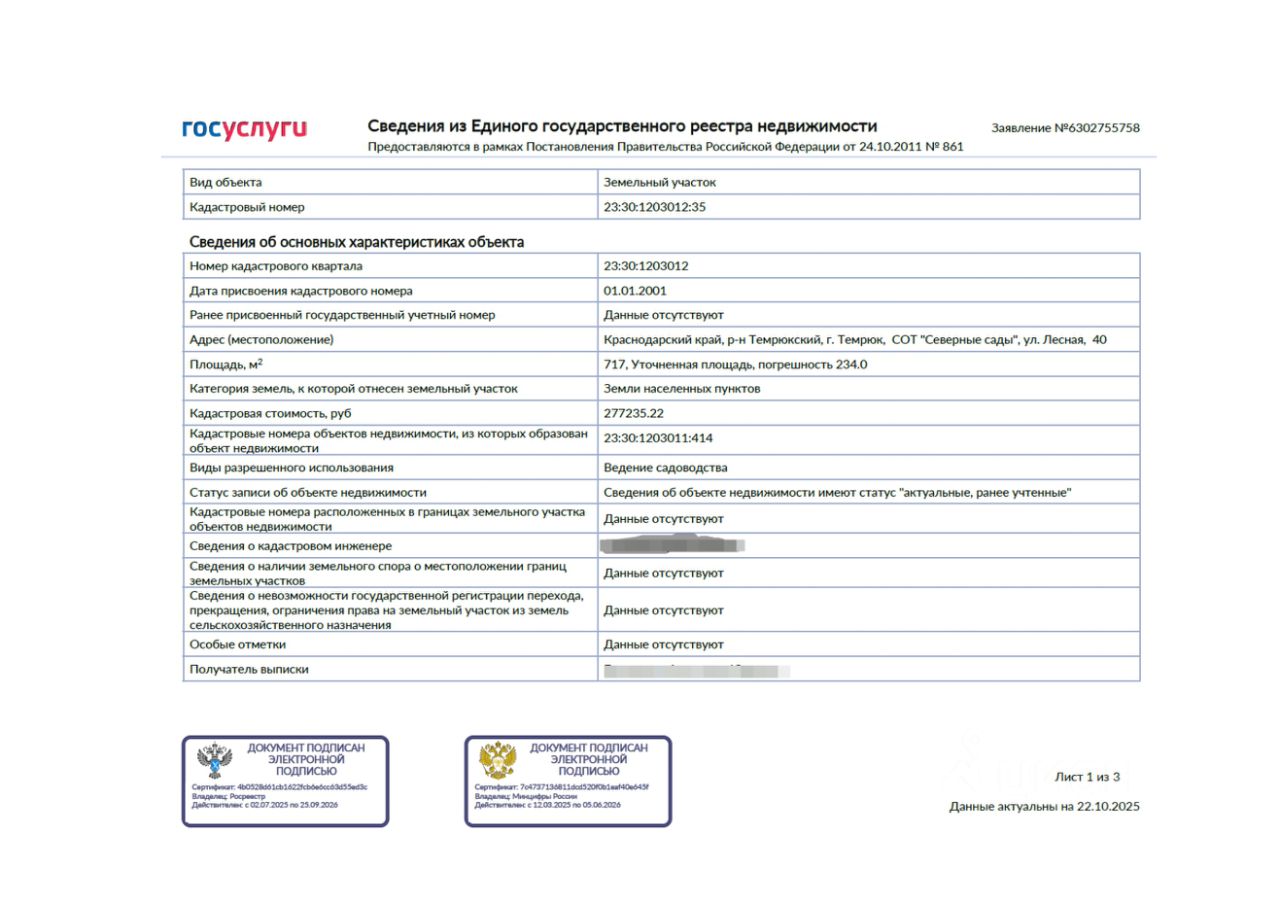Продаю земельный участок, кадастровый номер 23:30:1203012:35, по адресу город Темрюк СОТ "Северные сады" ул. Лесная, 40. Категория земель: земли населенных пунктов. Вид разрешенного использования: ведение садоводства (то есть можно построить садовый дом, с разрешением на строительство от администрации, зарегистрировать его в Росреестре и прописаться). Первая линия от лесополосы, живописное и тихое место, недалеко проходит ЛЭП, участок без обременений и ограничений. Я собственник.