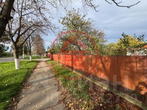 - Участок — 8,4 сотки, угловой, просторный; есть садовые деревья. Возможность организовать два въезда и пристроиться/построить дополнительные помещения.