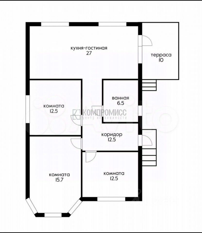 Первый этаж — 97 м²: просторная кухнягостиная (27 м²) с выходом на террасу, 3 спальни, санузел, коридор.