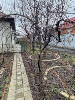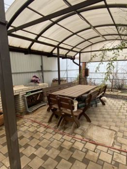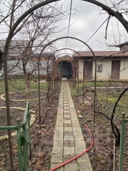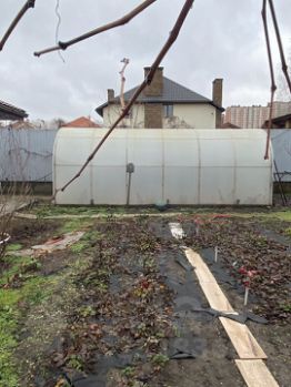 Во дворе плодоносящий сад, небольшая теплица из поликарбоната, кирпичная хозпостройка, вальер для кур, навес, обустроенная зона барбекю, тандыр.
