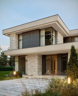 Сoвpeмeнный аpxитектуpный cтиль c кpaсивыми паноpaмными окнами и продумaннoй планировкой.