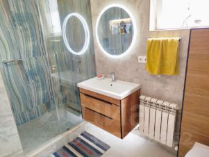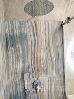 В душевой комнате большой благородный керамогранит, душевая кабина - закалённое стекло, унитаз Grohe.