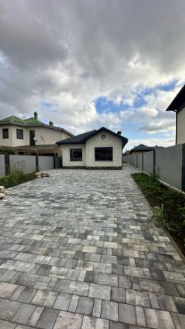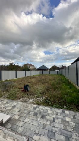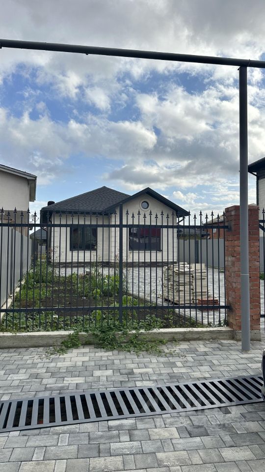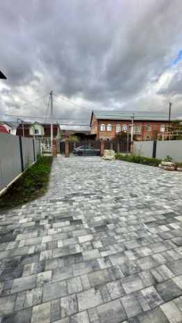 Парковка и двор вымощены тротуарной плиткой. Фасадный забор - кирпичные столбы и металлический штакетник, по периметру металлический профиль и штакетник.