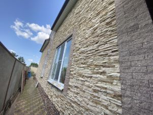 Качественное исполнение и красивая отделка камнем придают зданию особый шарм и изысканность. Лестница с кованными элементами добавляет элегантности и утончённости общему дизайну.