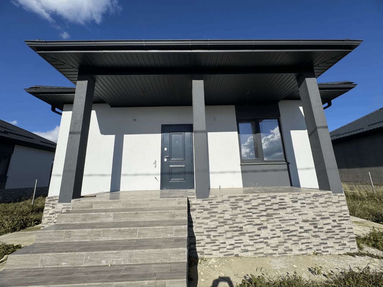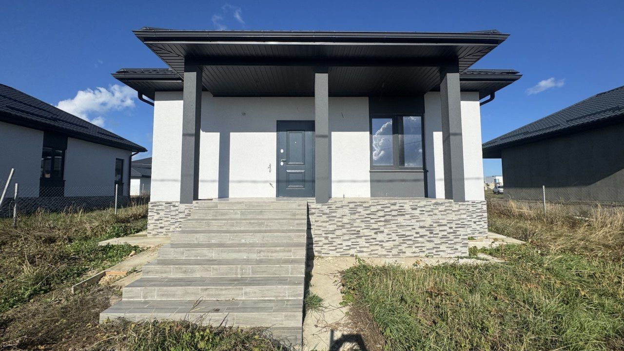 Дом полностью построен, предчистовая отделка - оштукатурены и выравнены стены, залиты, выравнены полы, разведена электрика и сантехника и т.д.