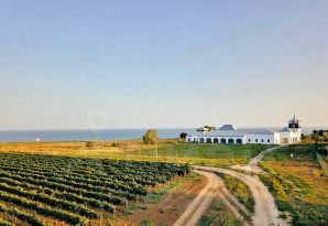 Все дома выполнены в едином архитектурном стиле. До моря  пешком - 5 минут.  Высокий берег , 45 метров в высоту. Зигзагообразный спуск к морю, пологий. В другую сторону от комплекса расположены виноградники и лиманы. Шикарное место!