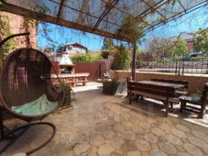 За домом также находится часть участка, на которой расположена терраса с оборудованной зоной отдыха и деревянной мебелью, мангал, тандыр. Терраса очень красиво озеленена вьющимися растениями.