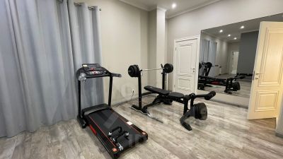 - 1 этаж с высотой потолков 3,5м., входная группа просторная прихожая с гардеробом, холл 18кв.м., гостиная кухня с камином и выходом на террасу и во внутренний двор и бассейну, две спальные комнаты 16 и 15кв.м., санузел совмещенный, прачечная, котельная, сауна на дровах, душевая, тренажерный зал;