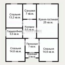 В доме: 3 изолированные спальни, кухня-гостиная с выходом на участок, коридор, прихожая, санузел, гардеробная, небольшая веранда.